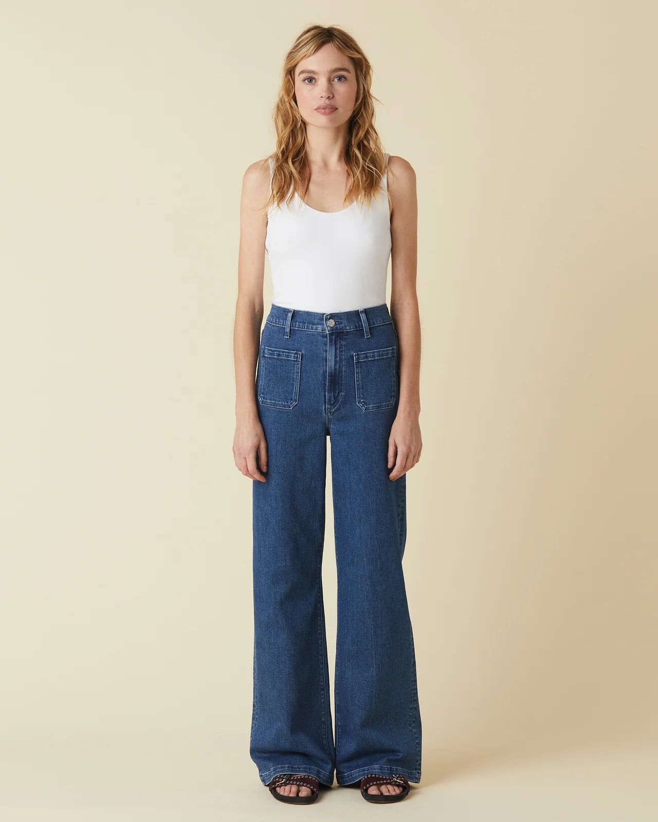Virginia patch pocket wide-leg jean is cut from the denim blended with the perfect amount of stretch for a comfortable fit. Designed to sit high on the waist, wide-legs and a full inseam. The rich indigo blue wash that makes them endlessly versaltile. Made in Los Angeles
