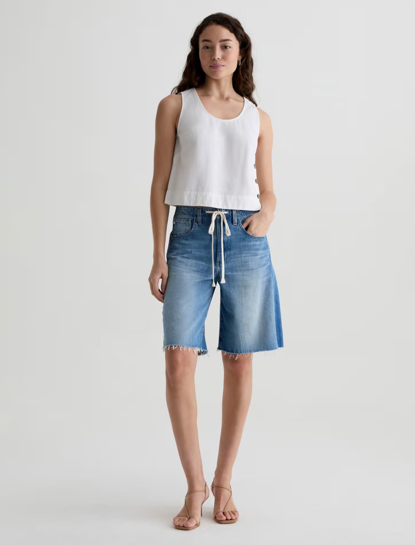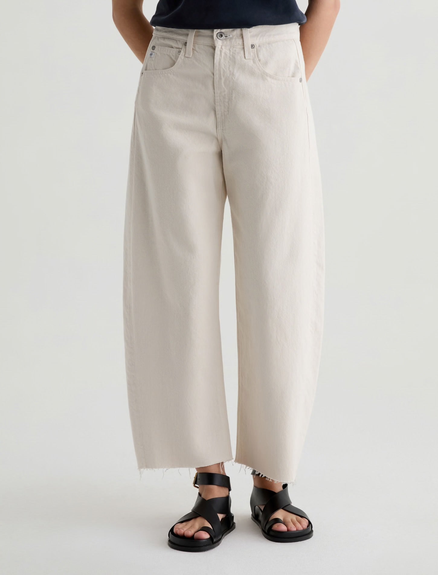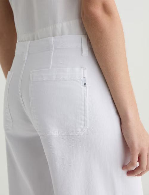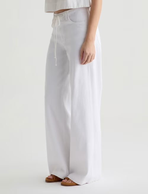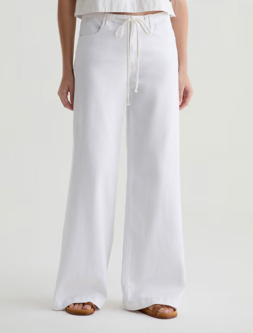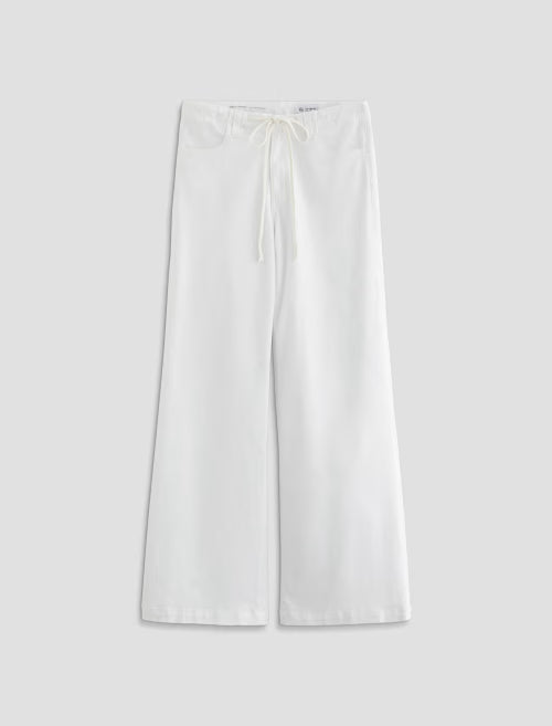 The Stella Cinched is a low-rise palazzo jean with a 32.5” inseam, crafted from Japanese comfort stretch denim in a clean white shade. This style features a subtle wide flare and a drawstring waist for a personalized fit.