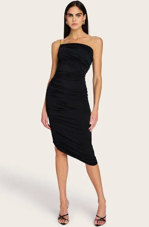 Turn heads in this slinky ruched jersey dress, featuring an edgy chain shoulder strap and a sophisticated asymmetrical midi silhouette. A statement-making choice for summer occasions.