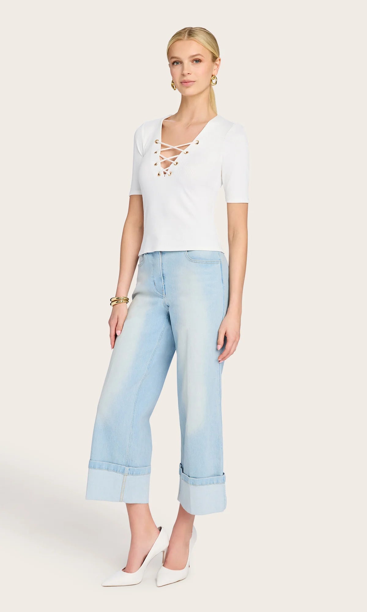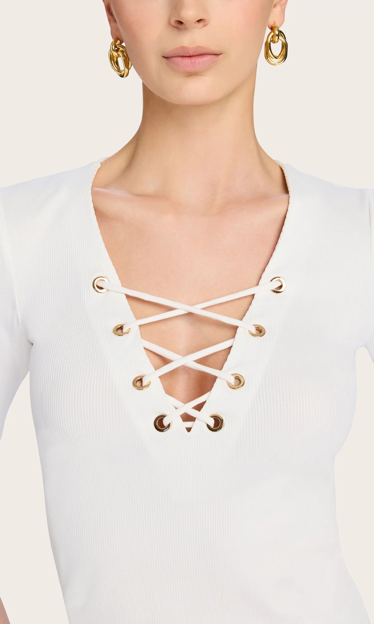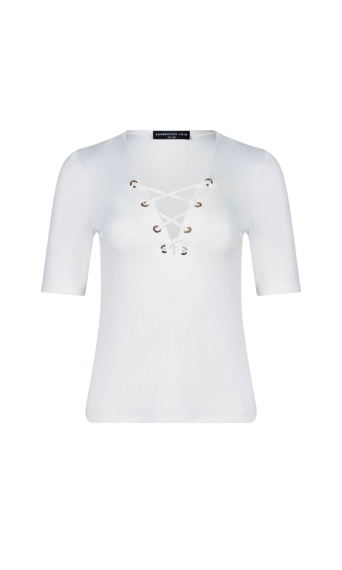 A deep V-neckline with lace-up detailing gives this top a modern allure, while fine ribbing creates a sleek look. A versatile piece that effortlessly pairs with pants, skirts, and shorts.
