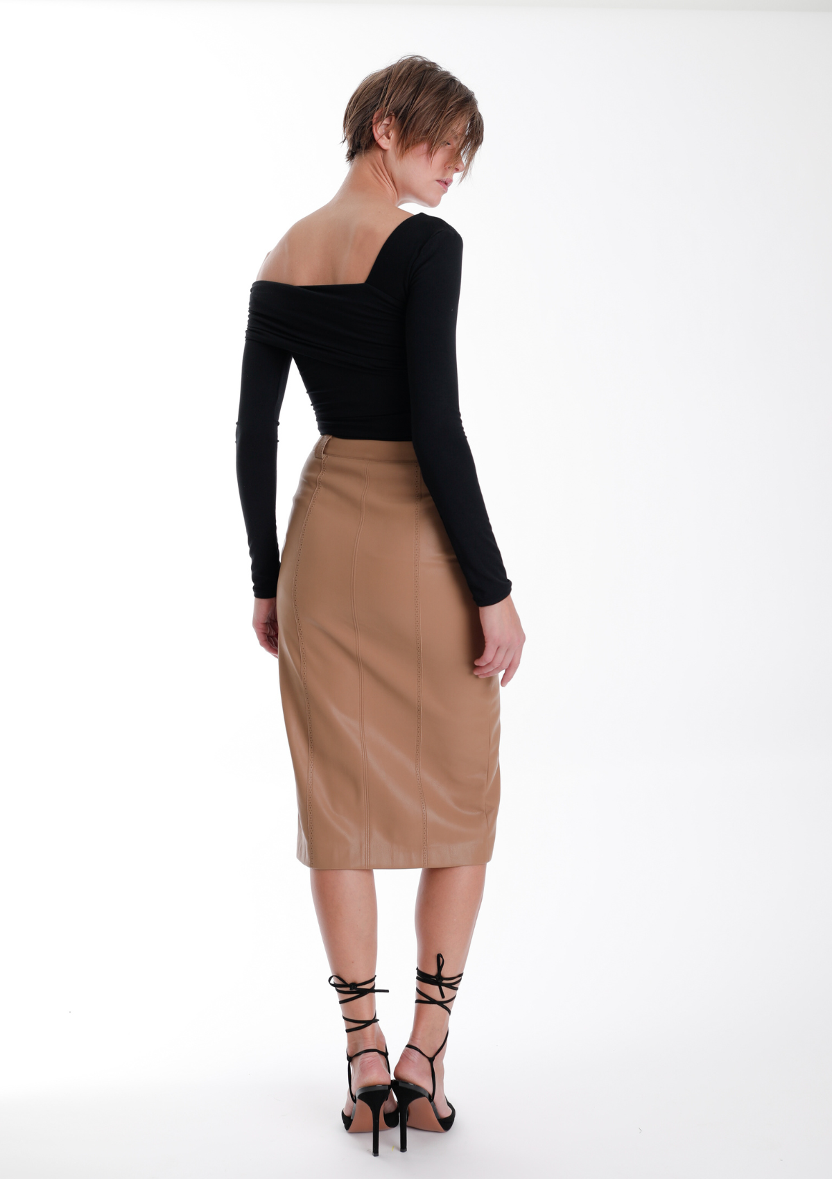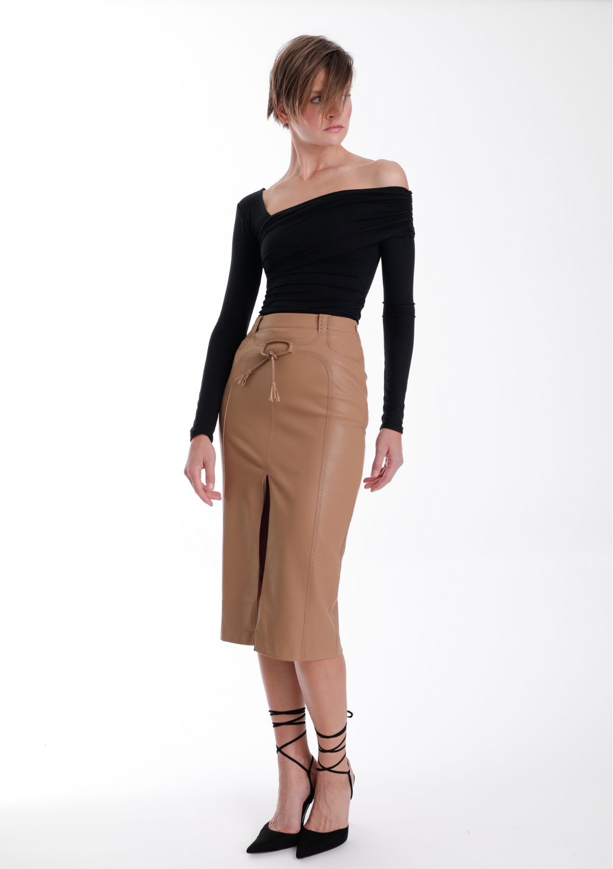 Step out in style with the Mona Vegan Leather Midi Skirt by Karina Grimaldi. This playful black skirt features a flattering midi length and a daring front slit for a flirty touch. The front tie detail adds a unique twist, while the side zip ensures a smooth fit. Convenient side pockets complete this chic look, perfect for carrying your essentials hands-free. Elevate your wardrobe with this edgy yet functional piece!
