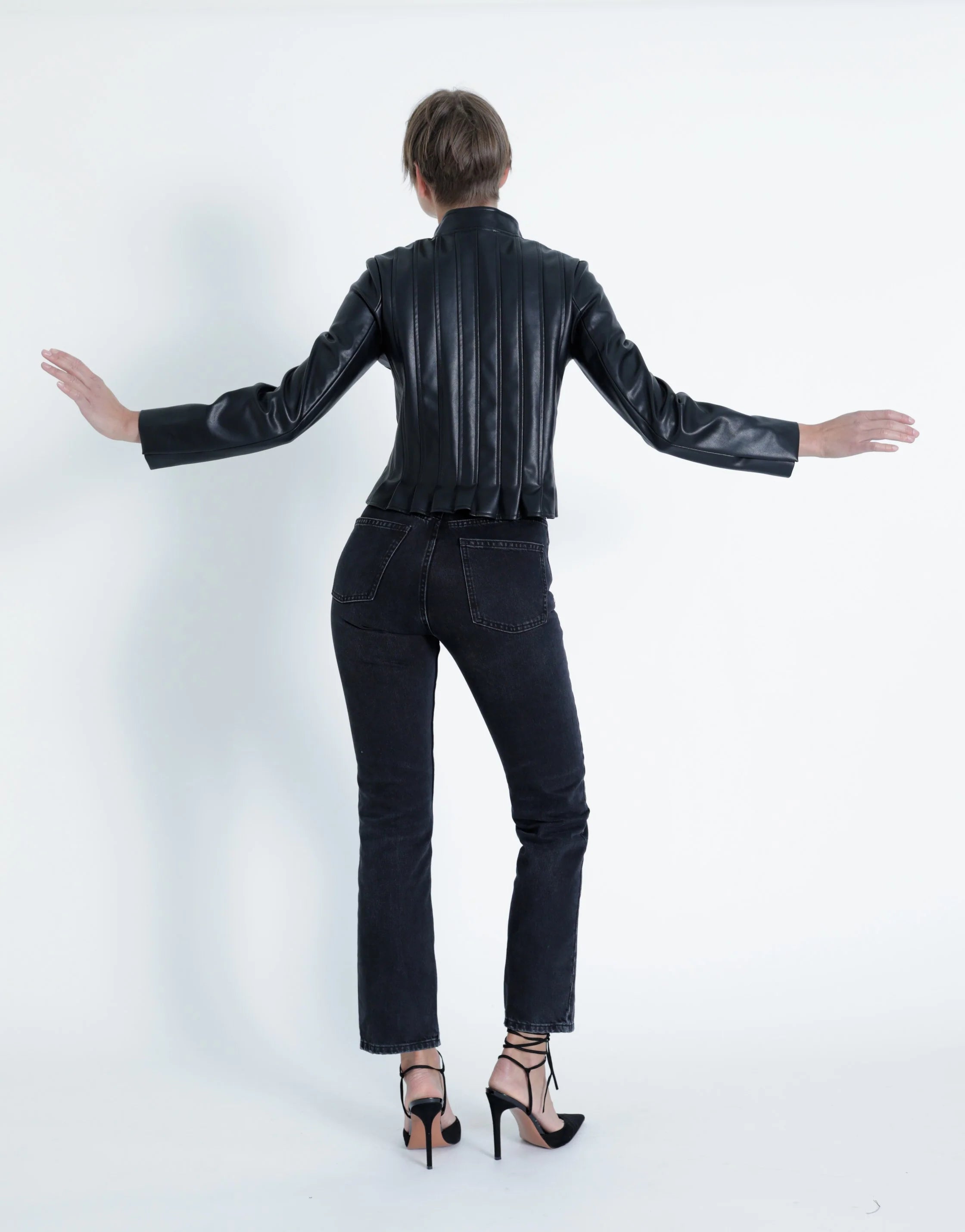 Elevate your wardrobe with the Karina Grimaldi Scarlett Vegan Leather Jacket, featuring elegant pleating on the bodice that flows into a graceful ruffle along the hem. Designed with long sleeves and a sleek button closure, this jacket combines edgy style with feminine details for versatile, standout looks. Perfect for adding a polished touch to any outfit while embracing cruelty-free fashion
