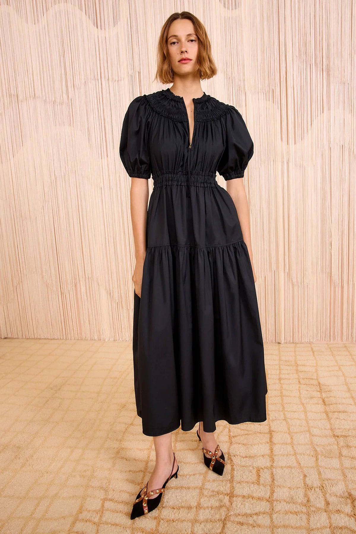 The Othella Dress is cut from crisp cotton poplin thats saturated with intricately hued florals inspired by the beauty of burnout textiles. A signature Ulla Johnson silhouette, this multicolored dress is framed by artfully puffed sleeves and is finished with ruching at the neck and waist. Model height: 5'10". Designed with an elastic waist and is loose at the bust and hip. Midi length. Short sleeves with elastic cuffs. Side pockets. Zipper along front.