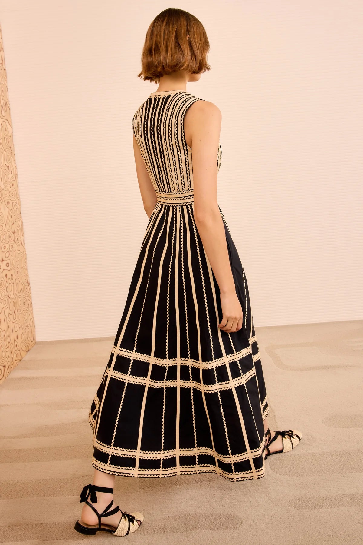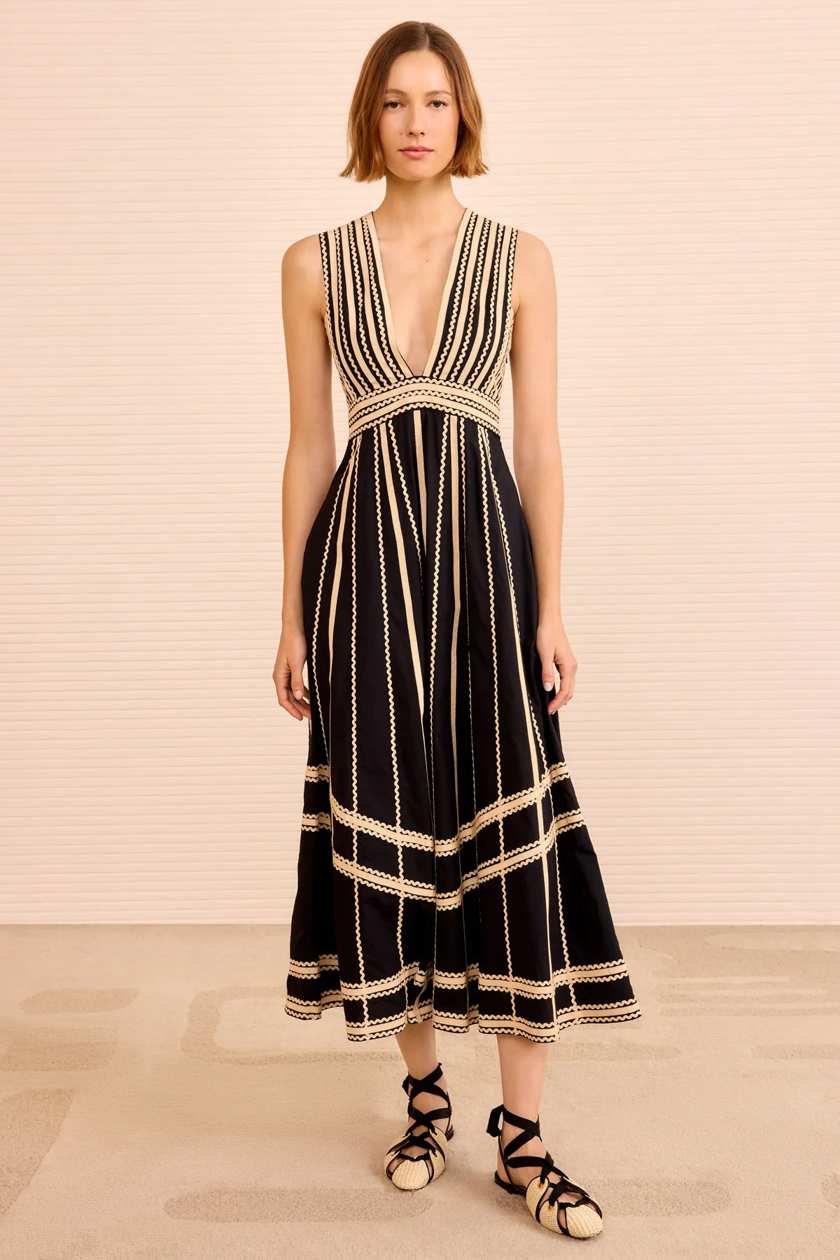The Palermo Dress is made from signature water-washed poplin that’s reinterpreted with ric-rac and grosgrain ribbons, adding striped texture and depth to the black silhouette. It has a form-celebrating fit with a plunging neckline and a full, gathered hem.