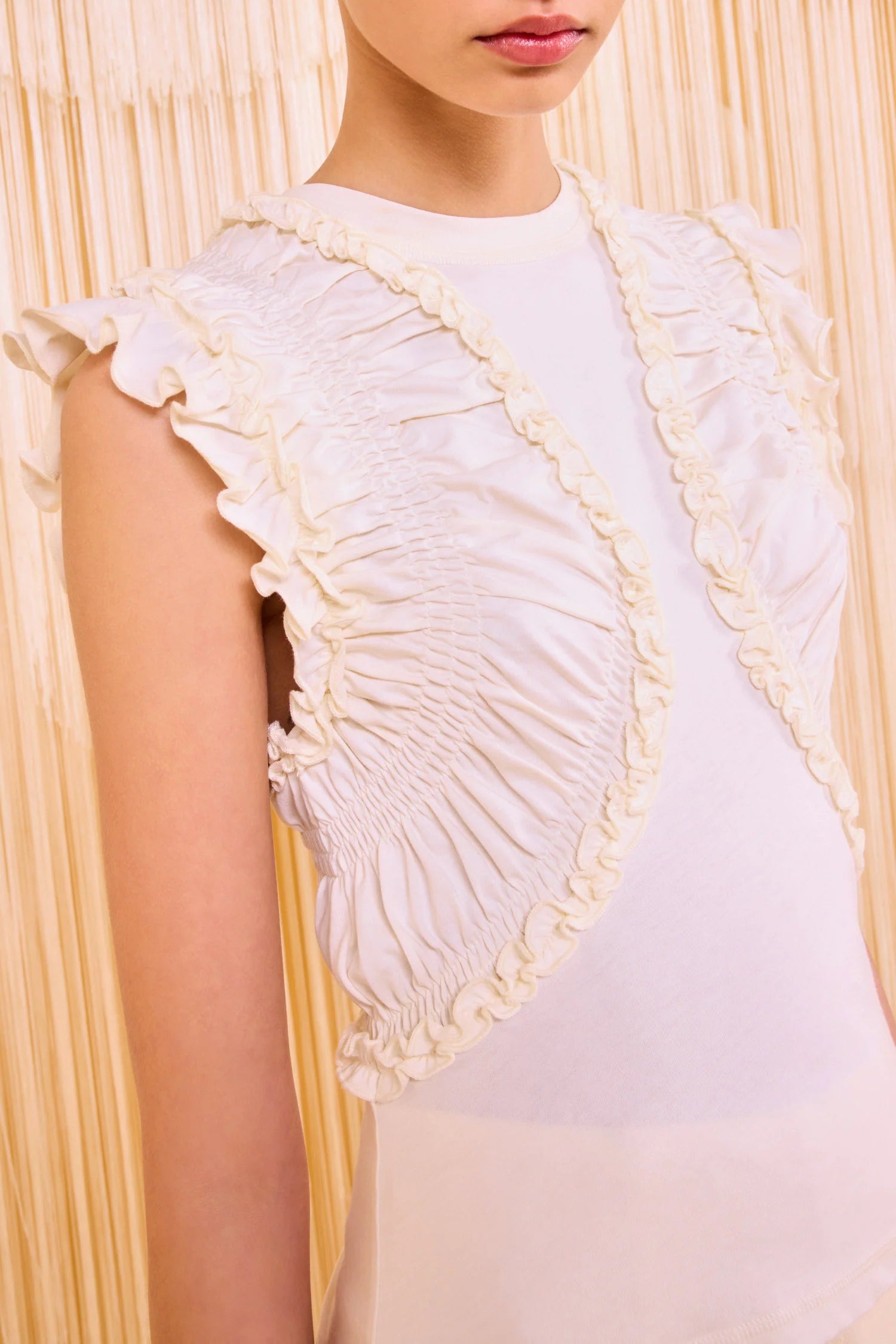 A year-round essential, the Val Top is spun from signature organic cotton jersey in a versatile shade of white. This sleeveless top has a round neckline with an easy fit that’s enlivened by ruched panels trimmed with dancing ruffles. It pulls over and effortlessly coordinates with denim.