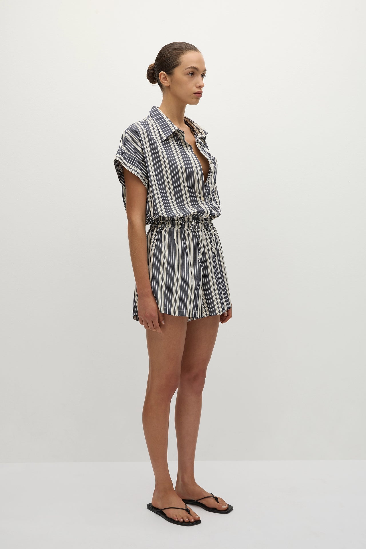 A relaxed playsuit with an oversized collar-style shirt with wide short sleeves and an elasticated waist, finished with a simple drawstring. From the waist they flare into a boyfriend-style short. Designed from a textured 100% organic cotton in a yarn-dyed navy stripe, inspired by vintage references, it is the perfect everyday travel companion.
