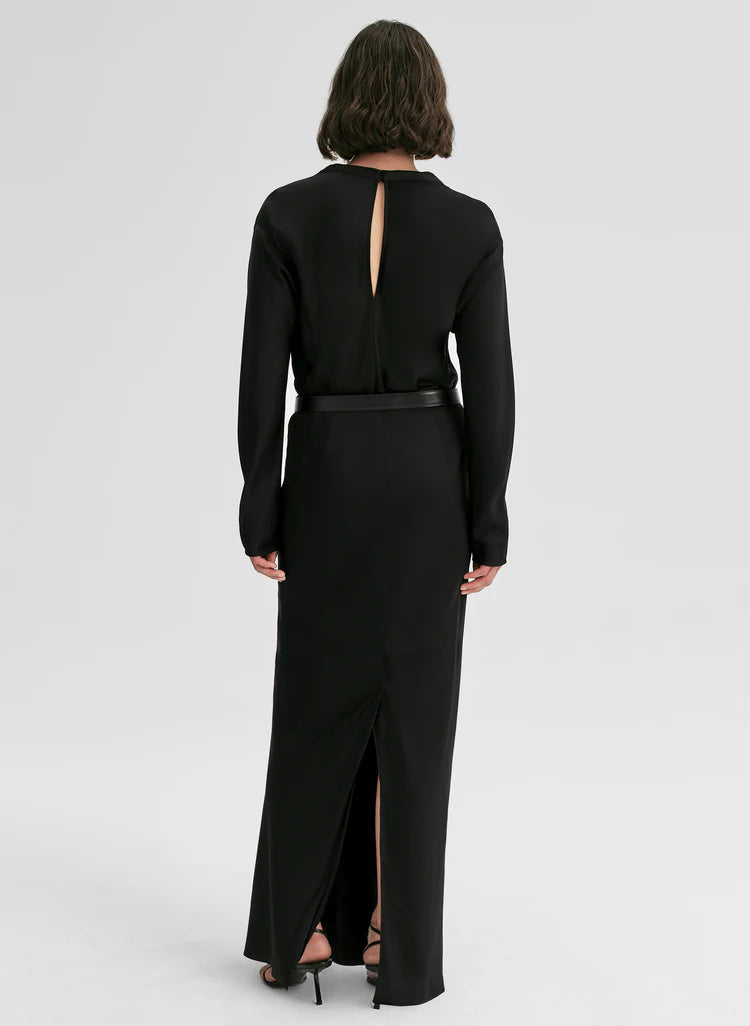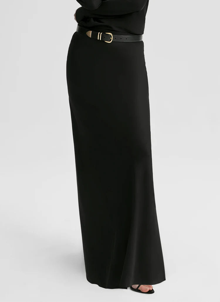 The Greta Skirt is crafted from our fluid viscose fabric in classic black. This long bias cut silhouette sways beautifully with every step.