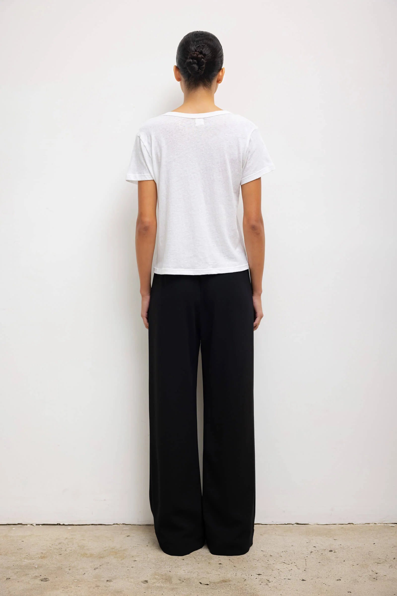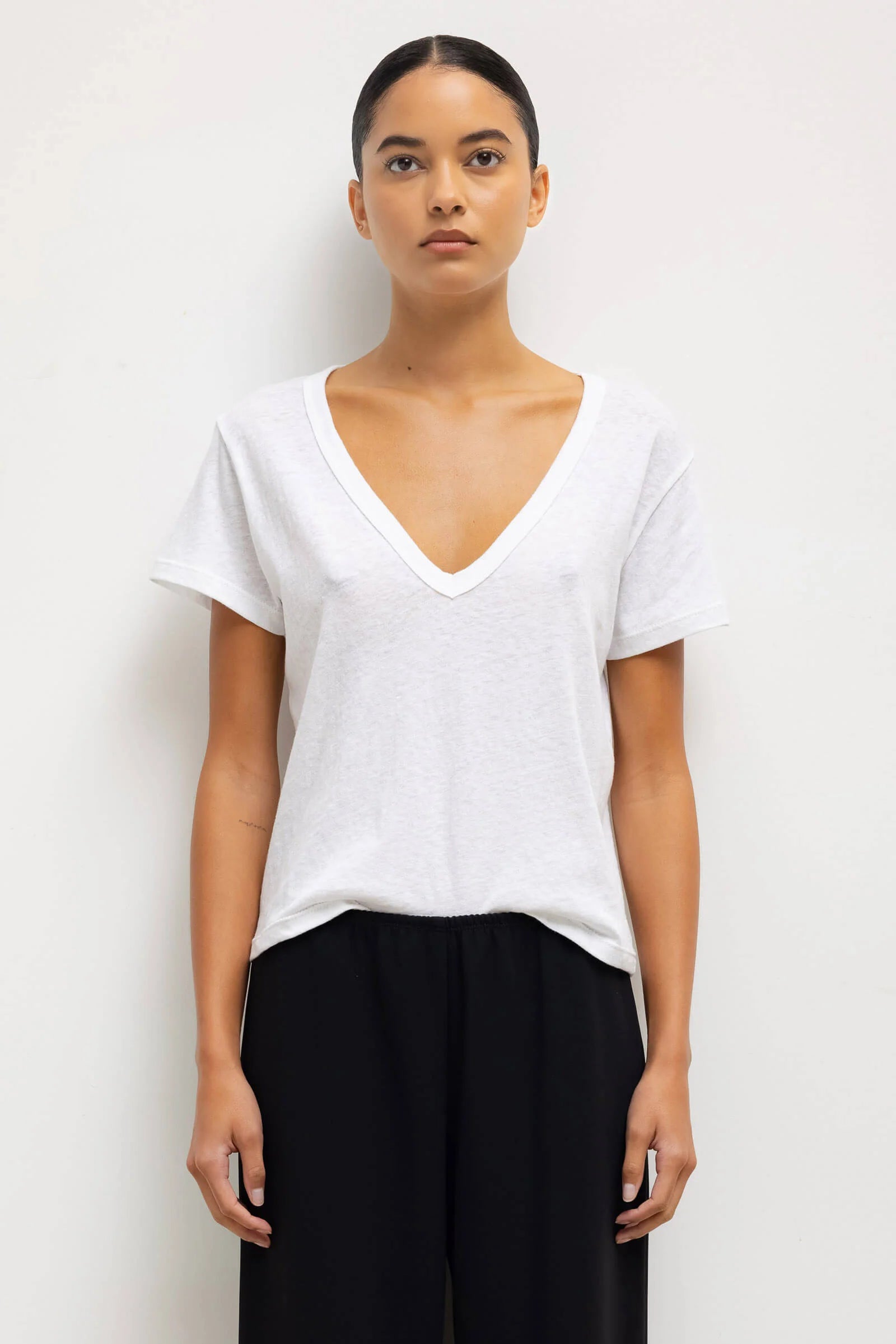 Cut in our feather light Laura Cotton, The Laura V Neck Tee features a wide V neckline, boxier silhouette, and short sleeves.