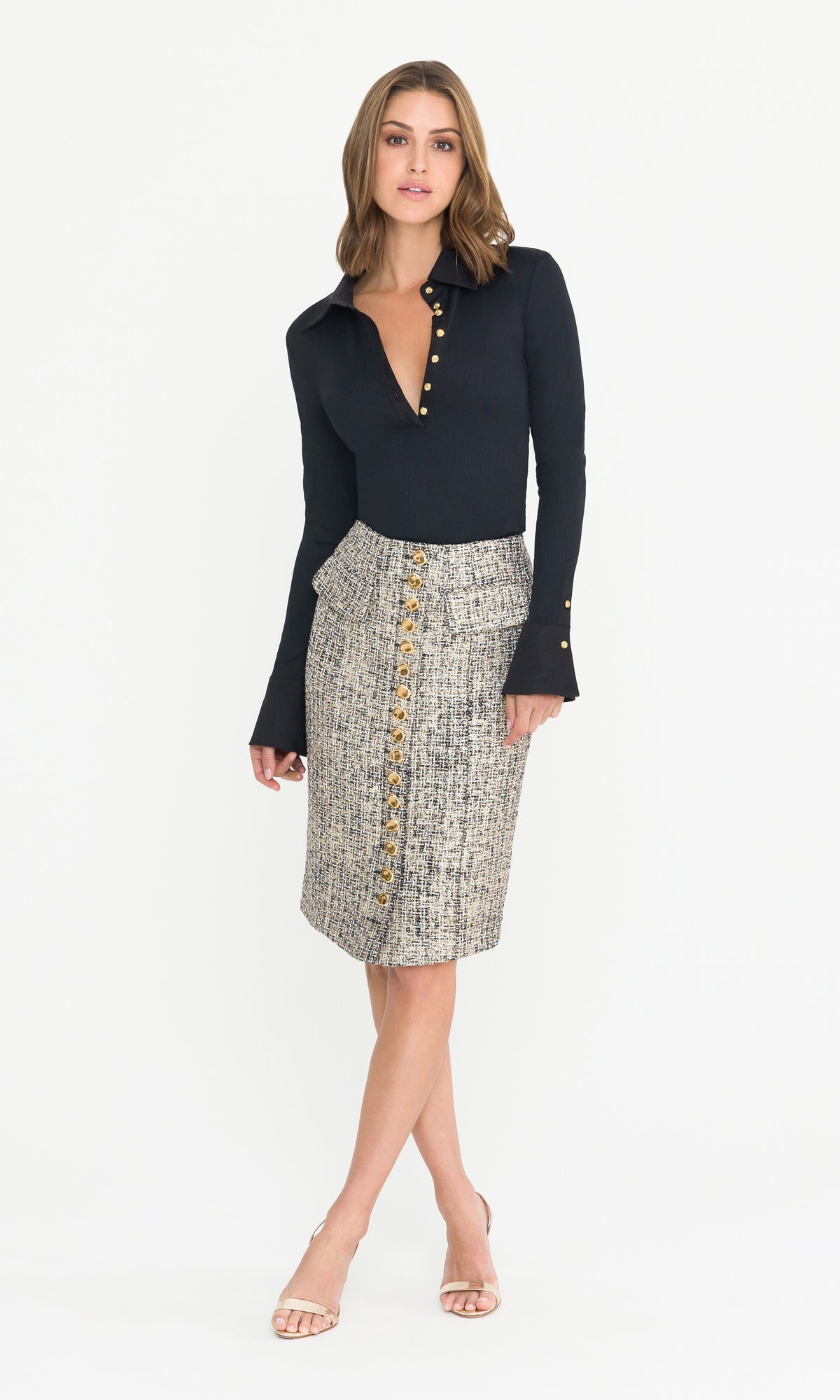 Polish meets edge. The Libbie Poplin Combo Top is cut from a sleek rib knit body, finished with crisp poplin cuffs and a sharp collar for contrast. Shimmering gold-tone buttons add just the right amount of detail, making this piece versatile enough to tuck into a tailored skirt, pair with vegan leather pants, or layer under a blazer. Effortlessly chic, it transitions from desk to dinner with ease.
