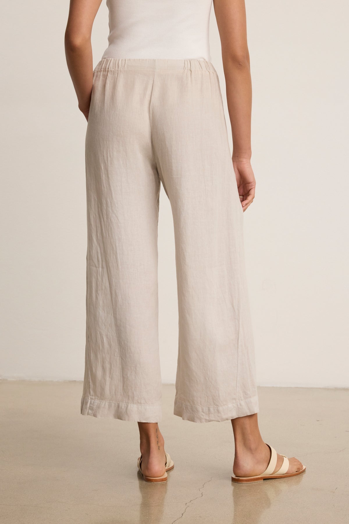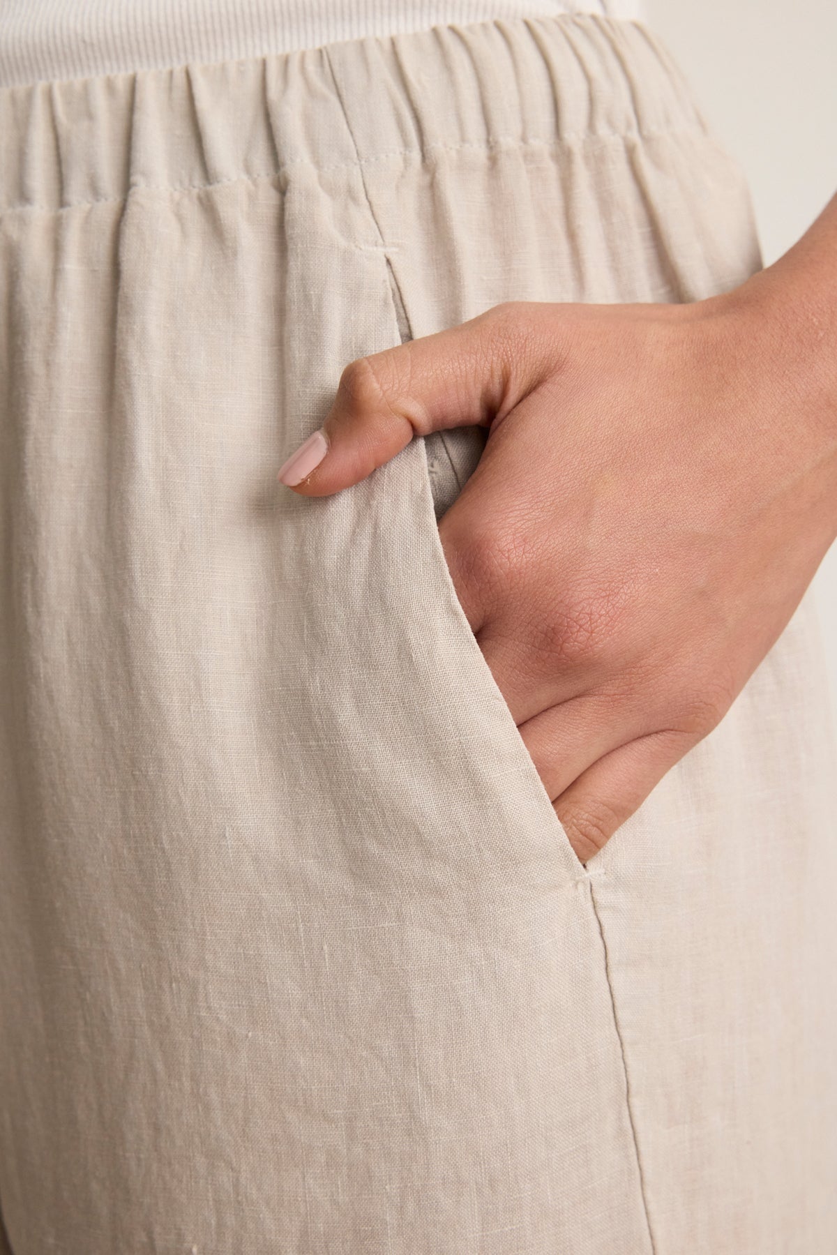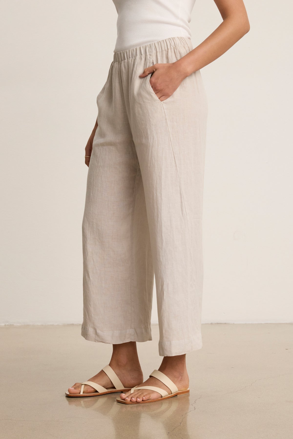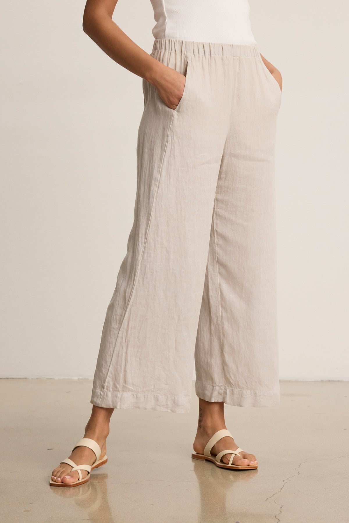 Velvet places a premium on relaxed elegance, designing daily essentials with seasonless style. The Lola pants are made from lightweight linen with an elasticated waist and cropped, wide legs for comfort.