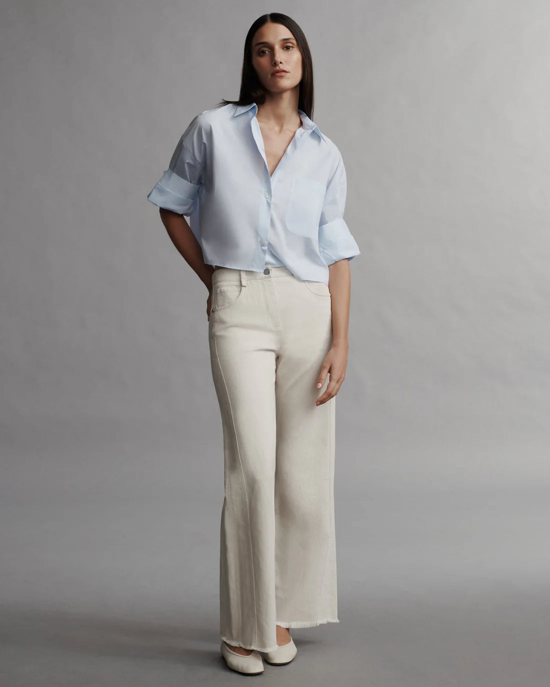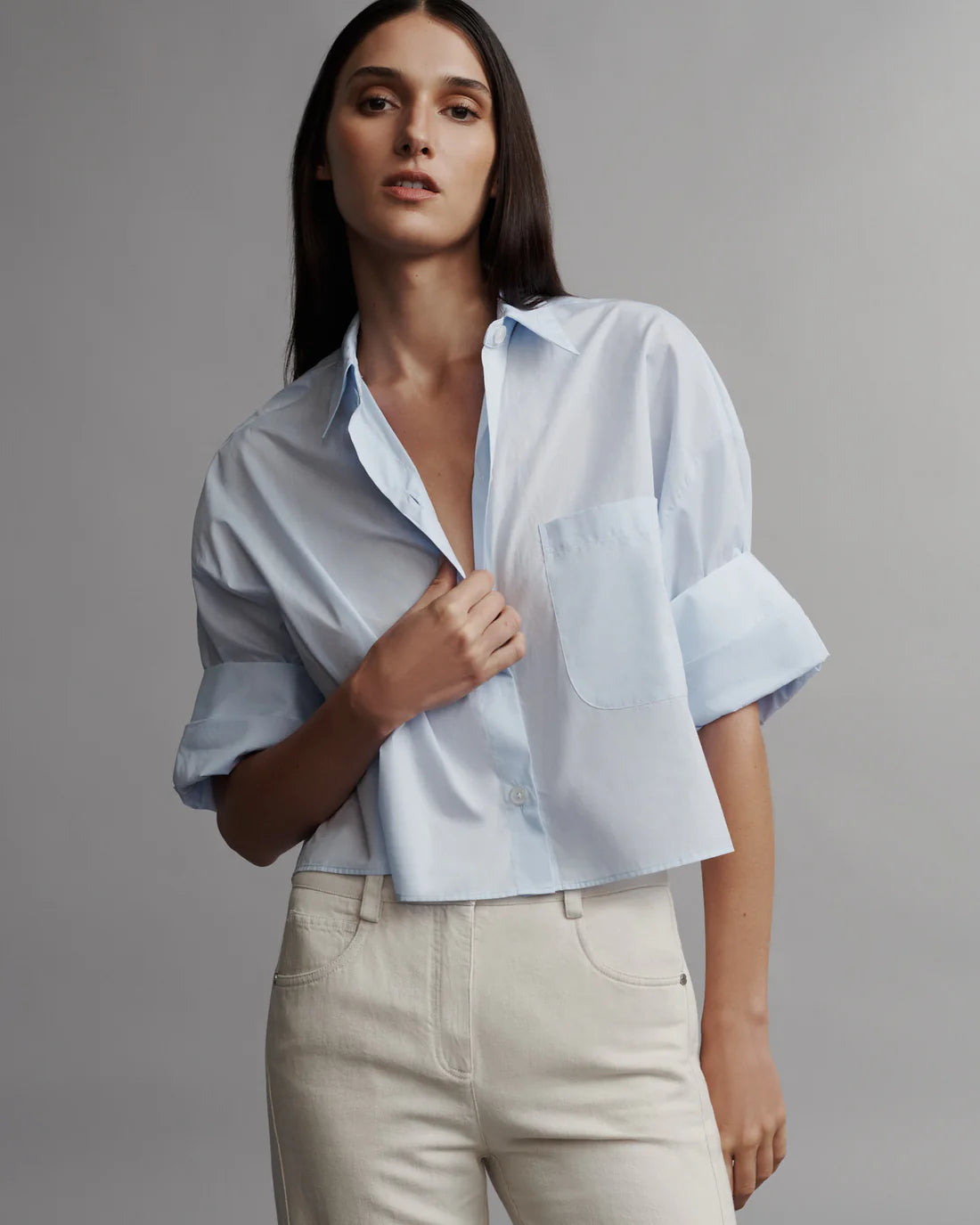 • TWP’s signature short sleeved button down crafted in superfine Italian cotton shirting. The Next Ex is a cropped, boxy silhouette, complete with a chest patch pocket, button up placket, spread collar, and our signature double roll button cuffs.