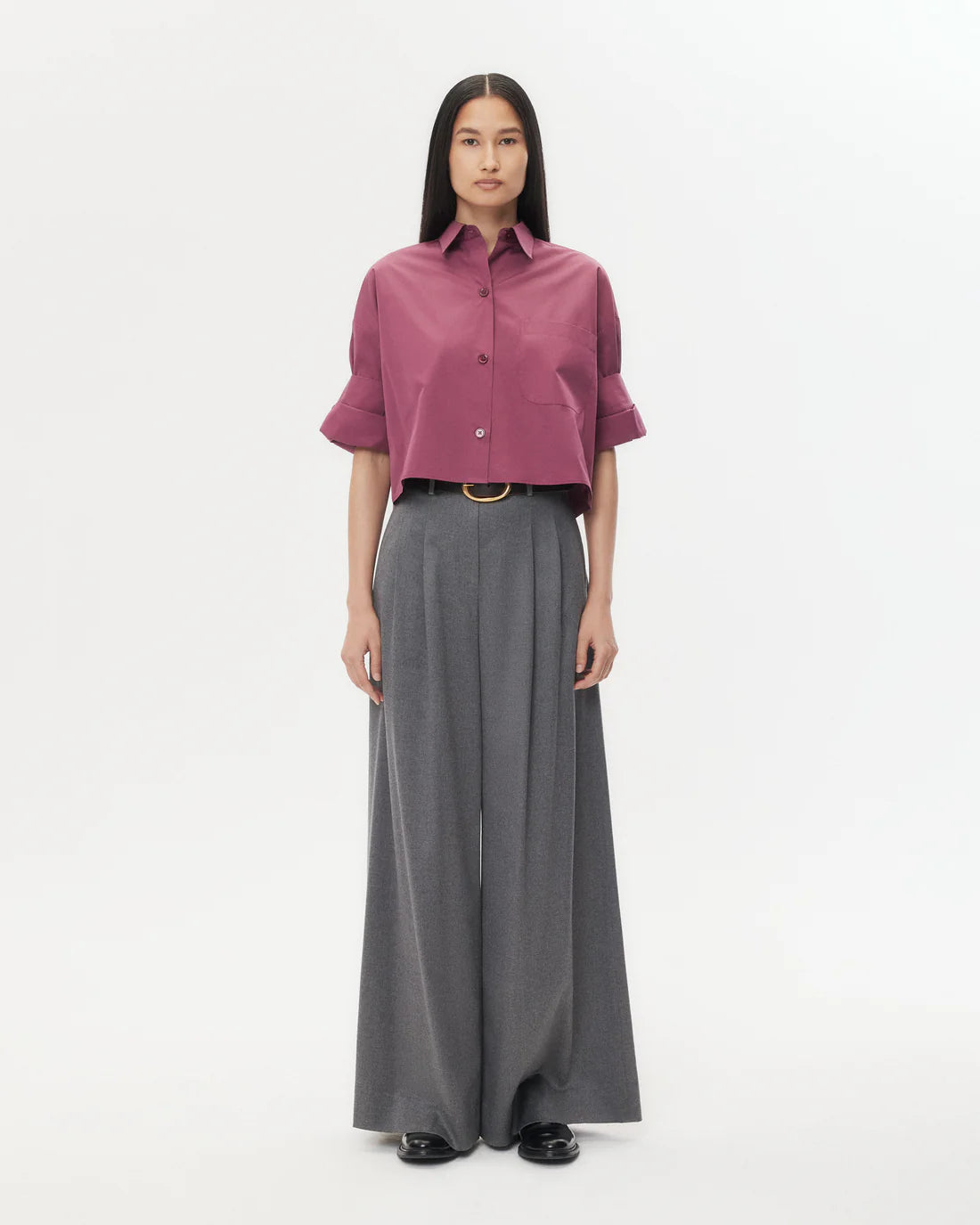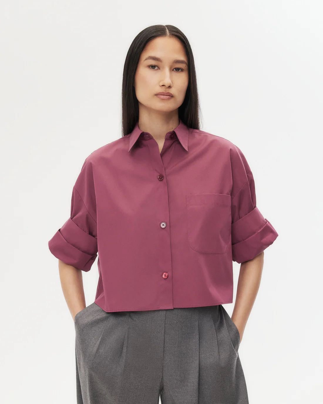 Cropped, short sleeved button down in cotton poplin. Boxy silhouette. Complete with a chest patch pocket, button up placket, spread collar, and our signature double roll button cuffs.