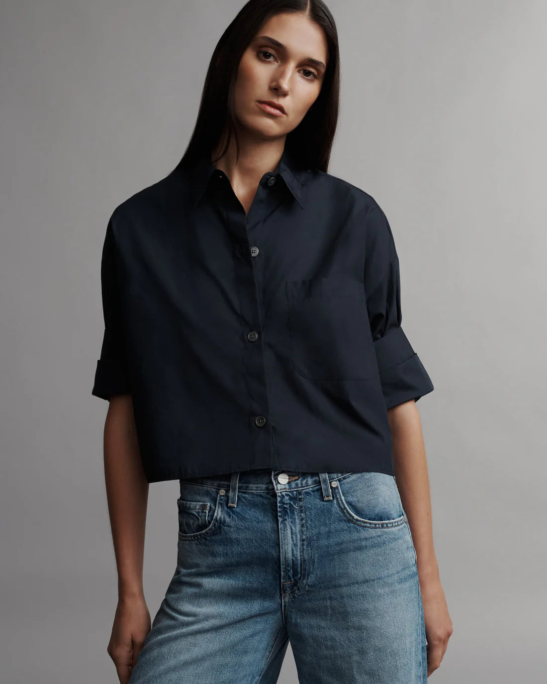- TWP’s signature short sleeved button down crafted in superfine Italian cotton shirting. The Next Ex is a cropped, boxy silhouette, complete with a chest patch pocket, button up placket, spread collar, and our signature double roll button cuffs.