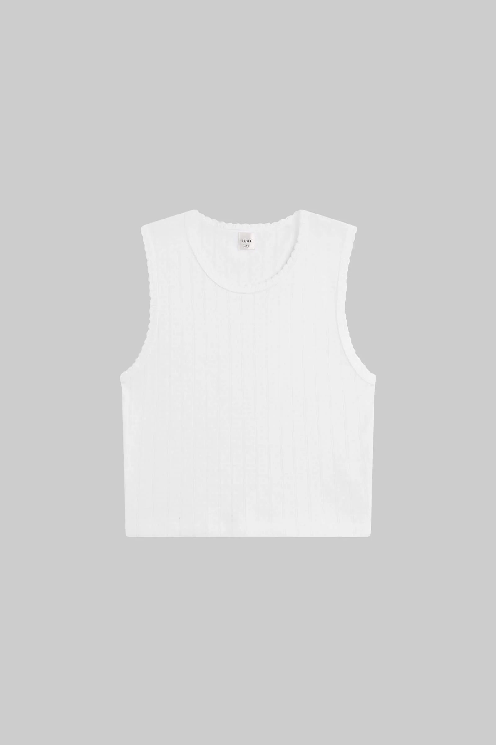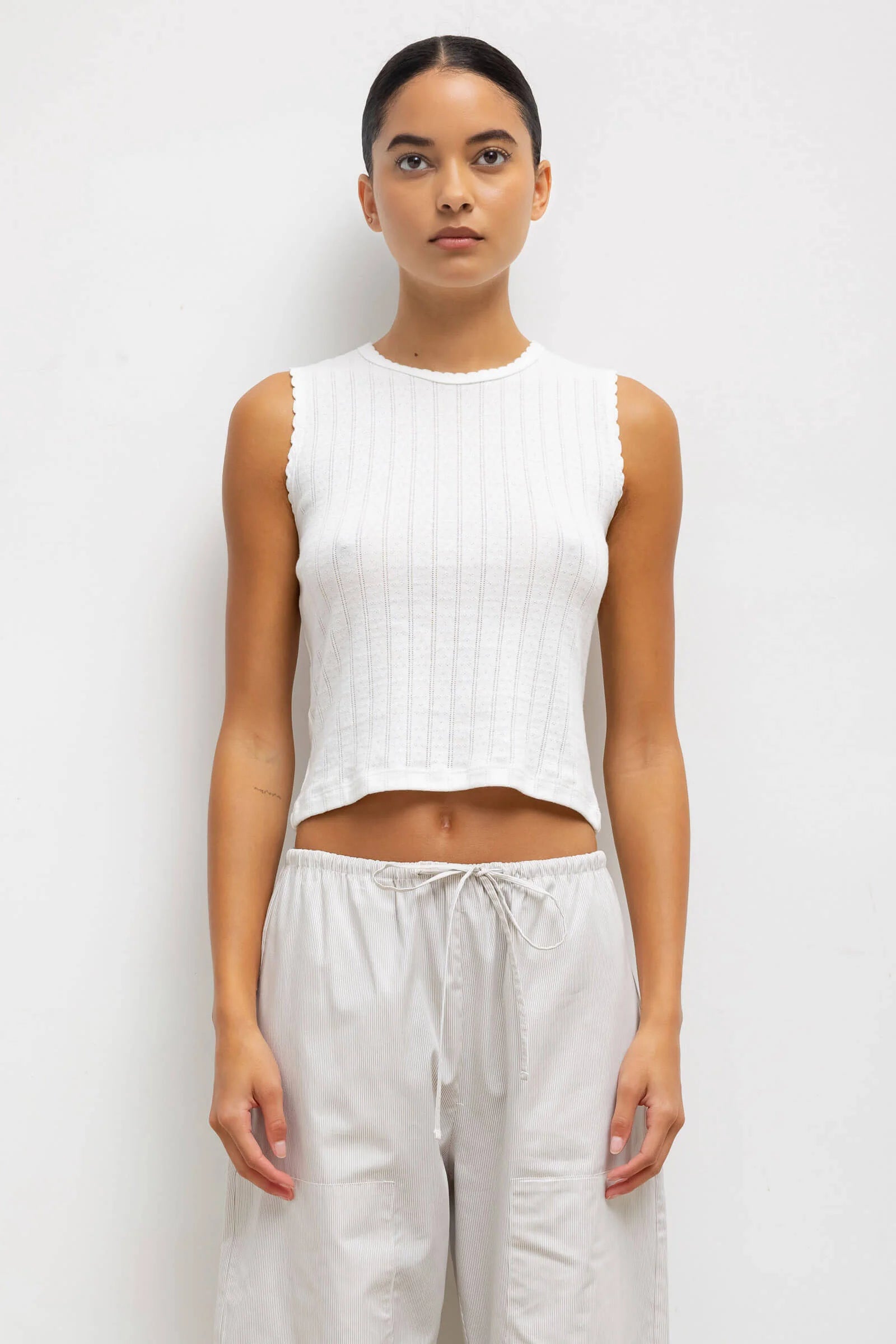 Cut in our nostalgic Pointelle Cotton, The Pointelle Sleeveless is a classic bateau silhouette, featuring signature pinhole stripes, dainty eyelets, and scalloped edging