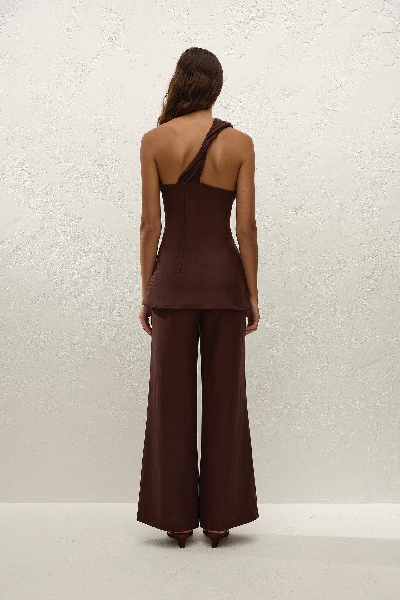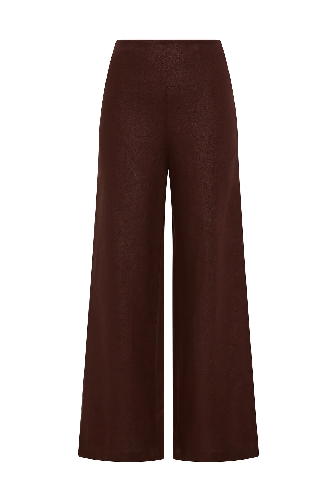 A softly tailored high-rise pant, designed from a signature 100% European Flax® linen in a deep shade of carob brown. Fitted through the waist with a smooth front, they fall into a refined, yet relaxed wide leg that flares at the hem and crops around the ankles. Style with the matching Agua Top for an elevated approach to linen set dressing.
