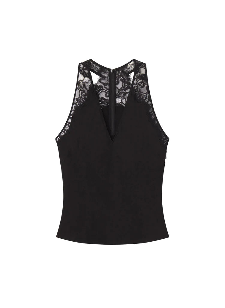 The Wes Top is your new evening essential. An elevated take on the sleeveless blouse, it features French heritage lace panels at the shoulders that bloom into a striking lace back. Cut from crepe-back satin, the V-neck silhouette drapes beautifully for a polished, fluid look. Finished with an invisible back zipper, it’s perfect for layering under blazers or styling alone for evening events—versatile, refined, and holiday-ready.