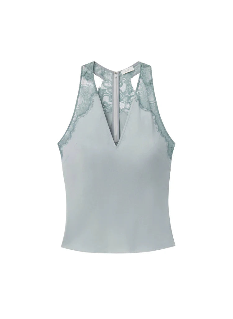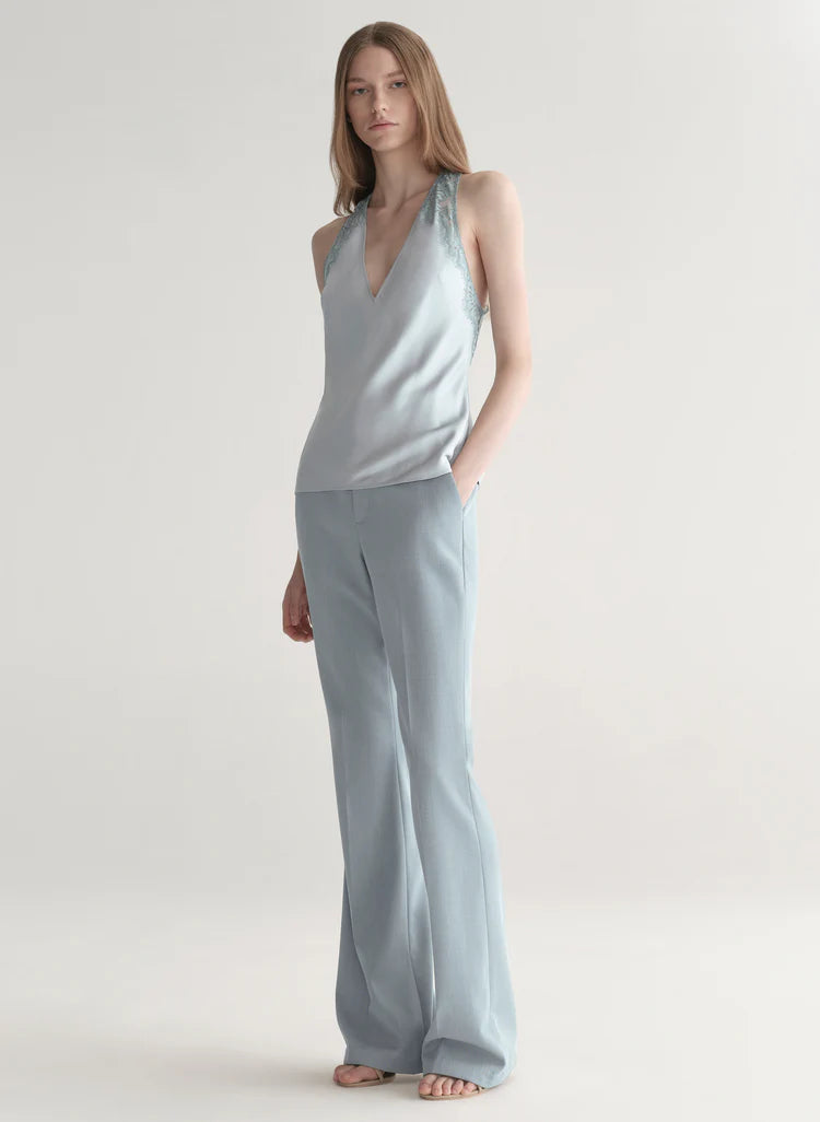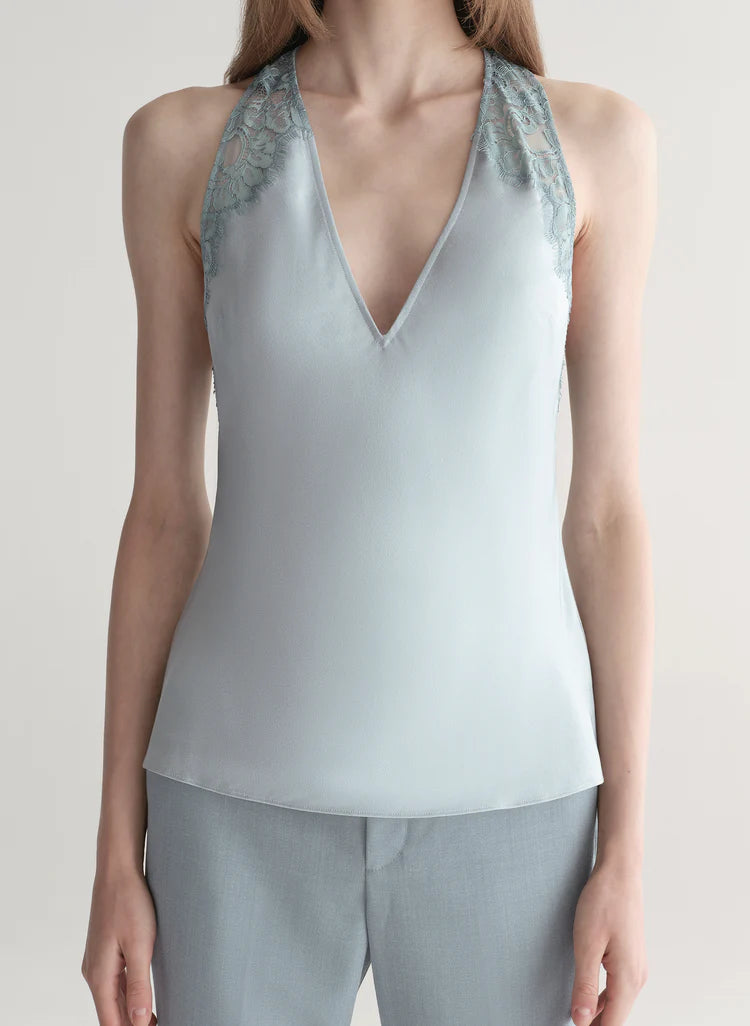 The Wes Top is your new evening essential. An elevated take on the sleeveless blouse, it features French heritage lace panels at the shoulders that bloom into a striking lace back. Cut from crepe-back satin, the V-neck silhouette drapes beautifully for a polished, fluid look. Finished with an invisible back zipper, it’s perfect for layering under blazers or styling alone for evening events—versatile, refined, and holiday-ready.