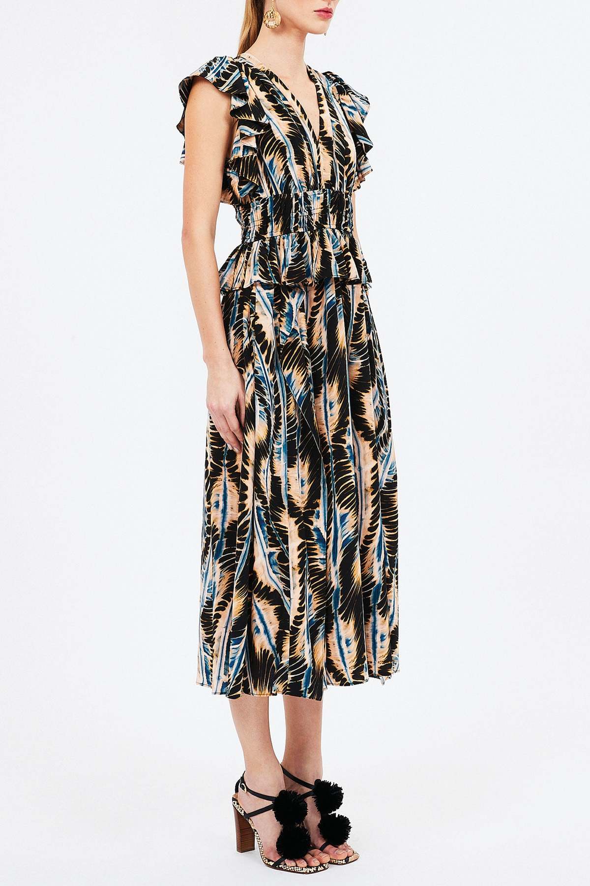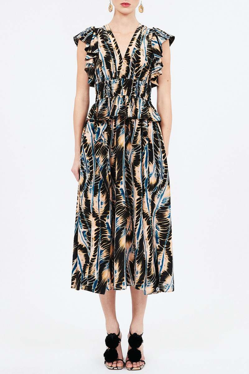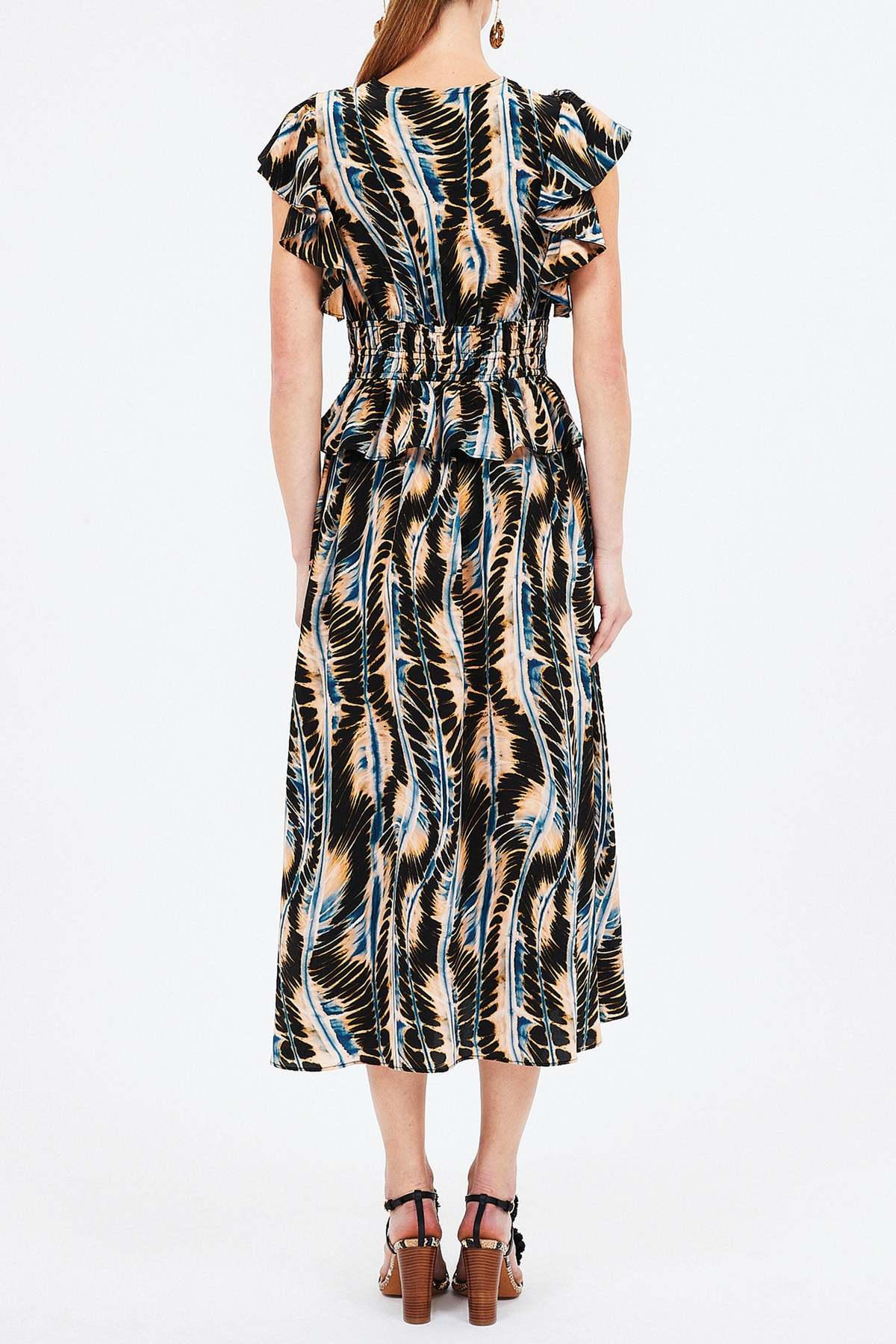 Effortlessly elegant, this silk midi dress features a flattering V-neckline, short flutter sleeves, and a smocked waistband accented with a delicate ruffle detail. The A-line skirt drapes beautifully, falling below the knee for a timeless look. A side zipper closure ensures a tailored fit