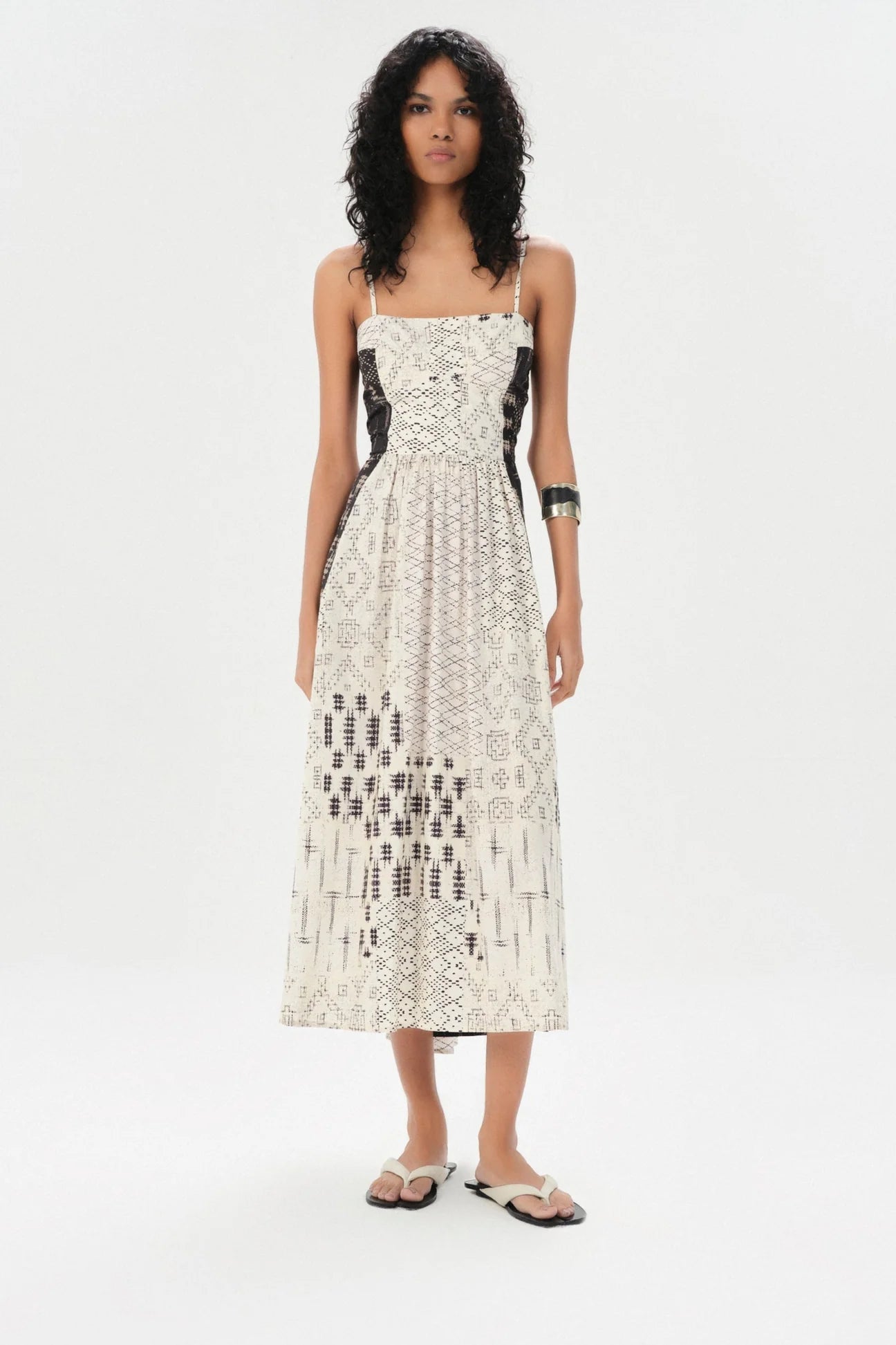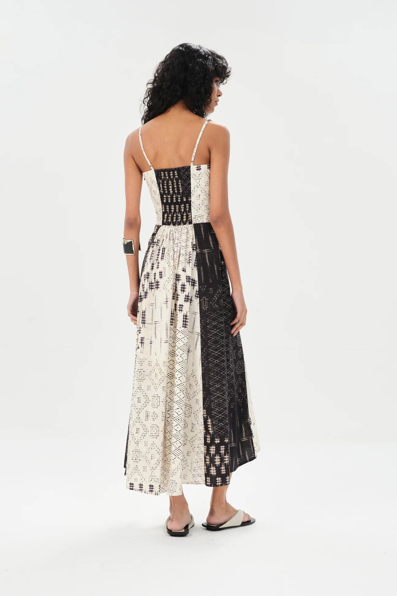 A fluid midi dress crafted from organic cotton, featuring a fitted bodice with delicate straps and a smocked back for ease. The contrast paneling adds depth to the hand-dyed print, blending artisanal tradition with modern design. Perfect for warm days.
