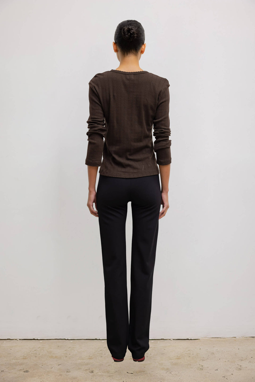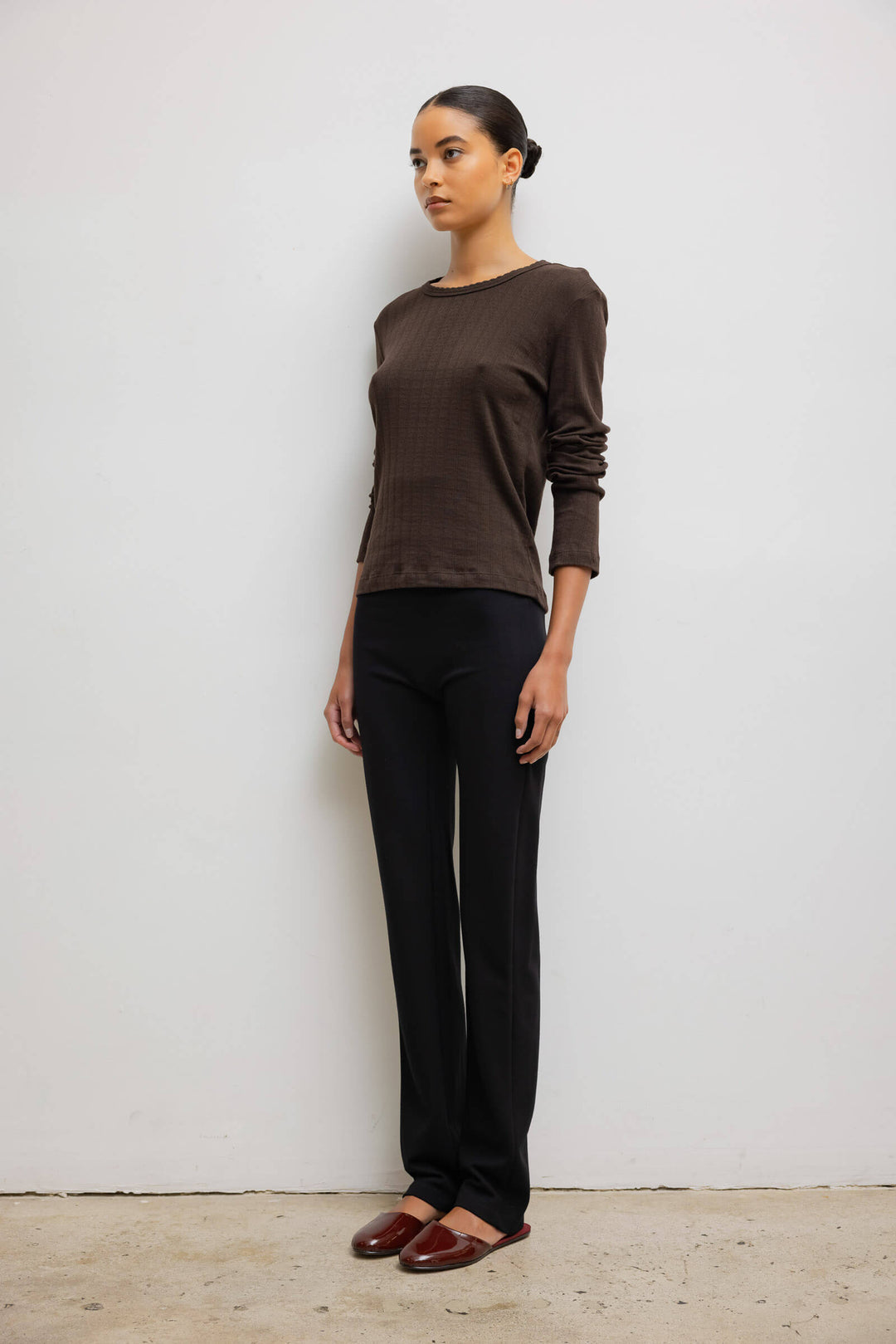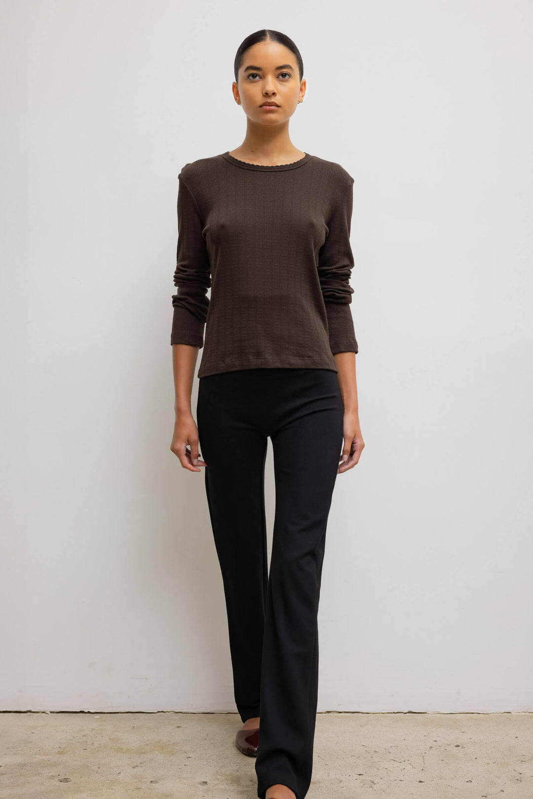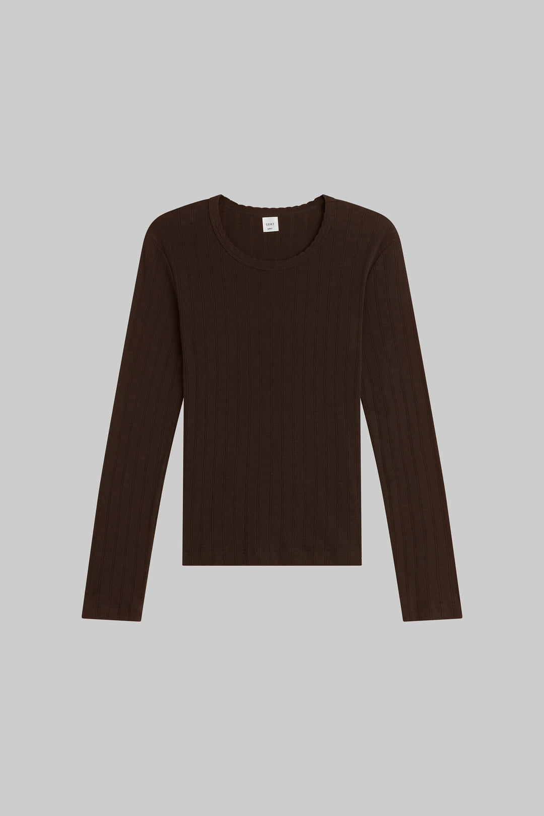Cut in our nostalgic Pointelle Cotton, The Pointelle Slim Fit Long Sleeve features a classic crew neckline with our signature pinhole stripes, dainty eyelets, and scalloped edging. Full length with fitted long sleeves.