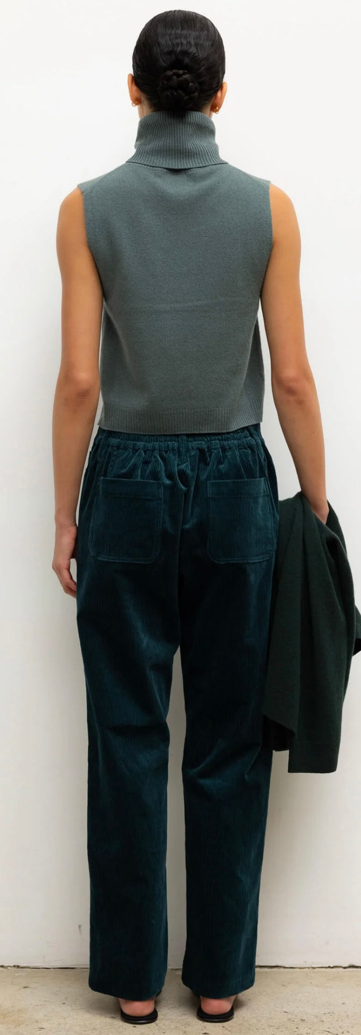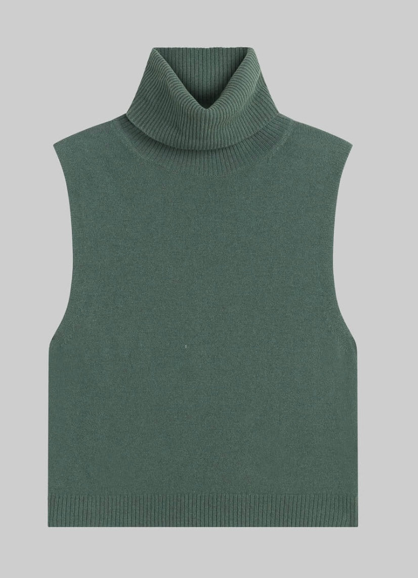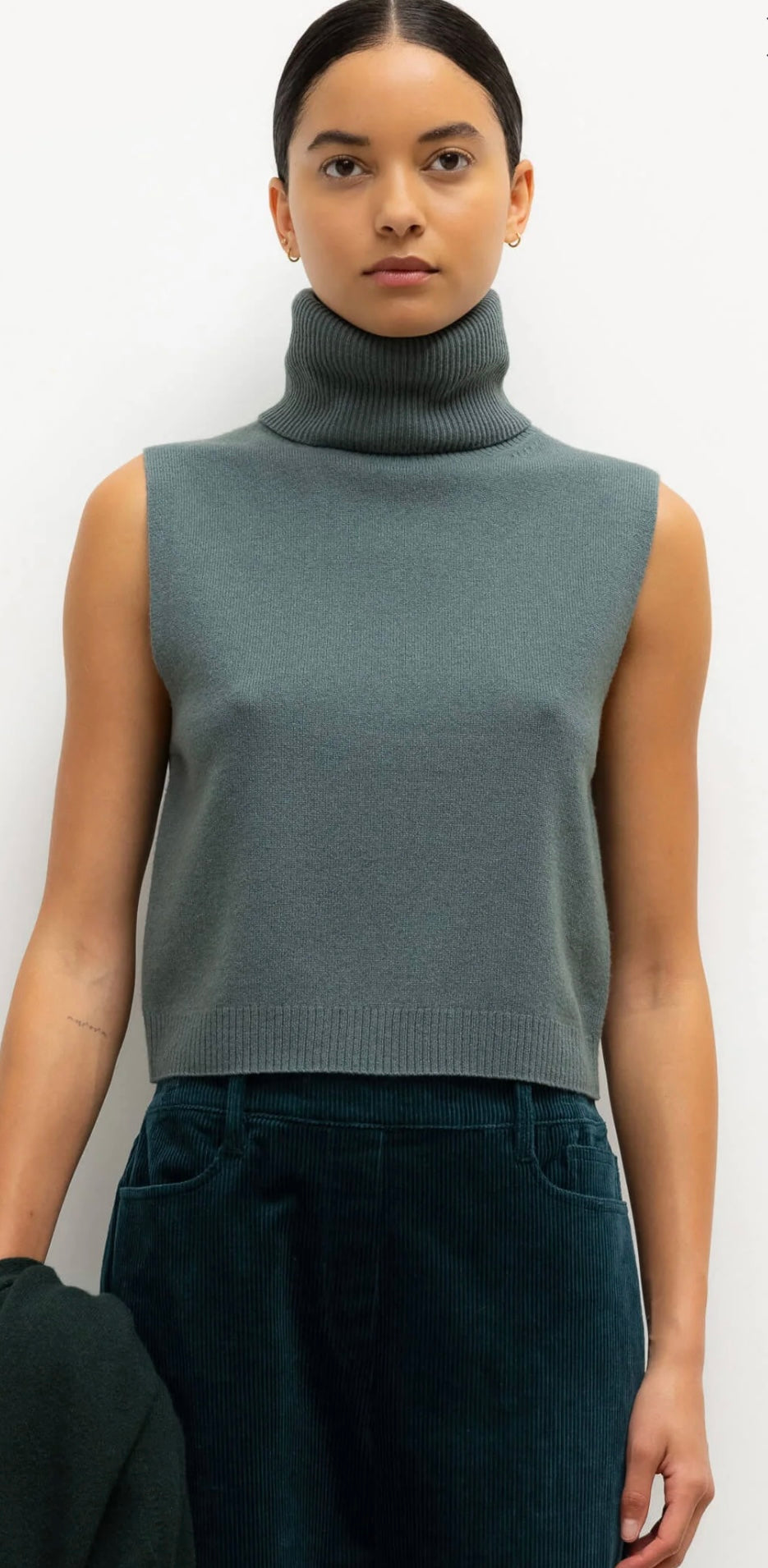 Knit in our plush Zoe Wool/Cashmere Knit, The Zoe Sleeveless Turtleneck is a fitted shell silhouette with a fold-over turtleneck. We're wearing this by itself - then layered underneath matching Zoe Knits and crisp button-downs.