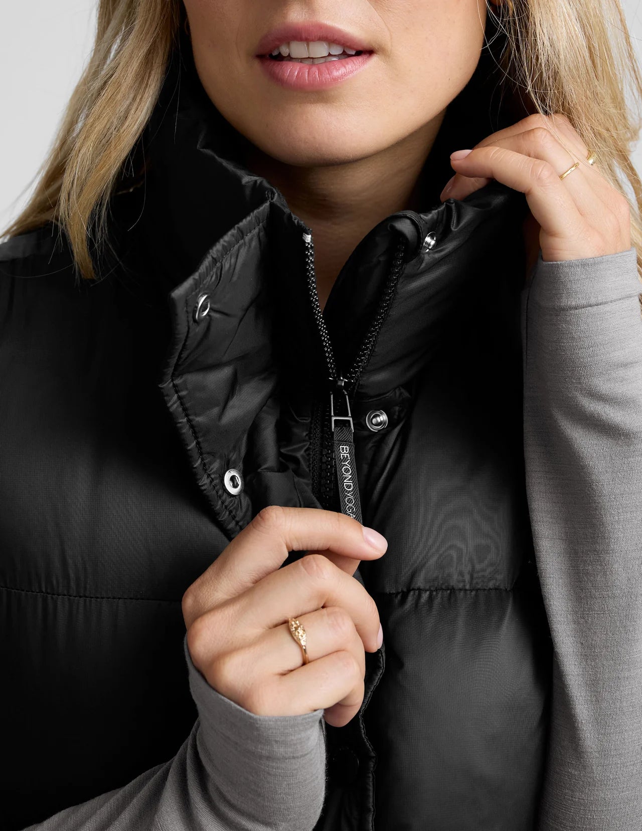 In case you didn't know, we're big on options. Our puffer vest has both zipper and button closures at front. The side pockets are great for keeping hands warm and small essentials secure. There's even a hidden interior bungee at the waist so you can wear it fitted or a little looser depending on what you've got layered underneath.