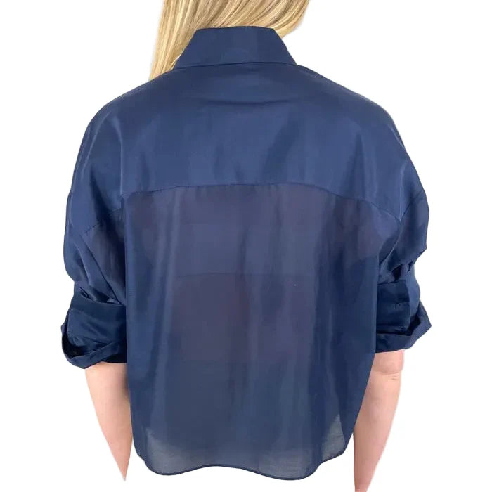 The perfect standard sizing, spread collar, short sleeves, button up placket, cropped, boxy blouse.