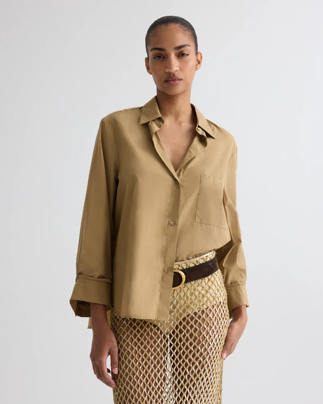 Oversized button down shirt in superfine Italian cotton shirting. The Next Morning is a relaxed silhouette with a center box pleat at the back. Complete with an exposed button up placket, chest patch pocket, spread collar and single roll button cuffs.