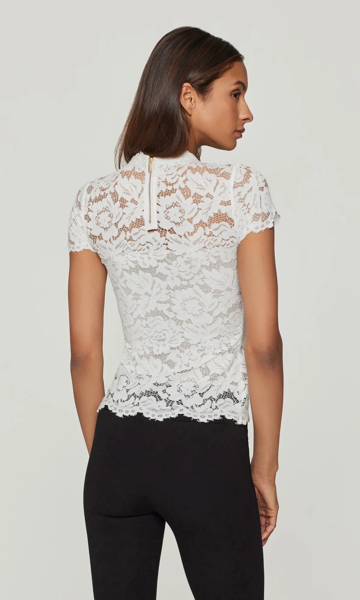 The Giada Lace Top in white offers delicate lacework with a refined silhouette grounded in rich color. Its fitted body, scalloped edges, and mock neck add modern romance, while the crisp white hue enhances the intricate lacework, offering a fresh, refined look.