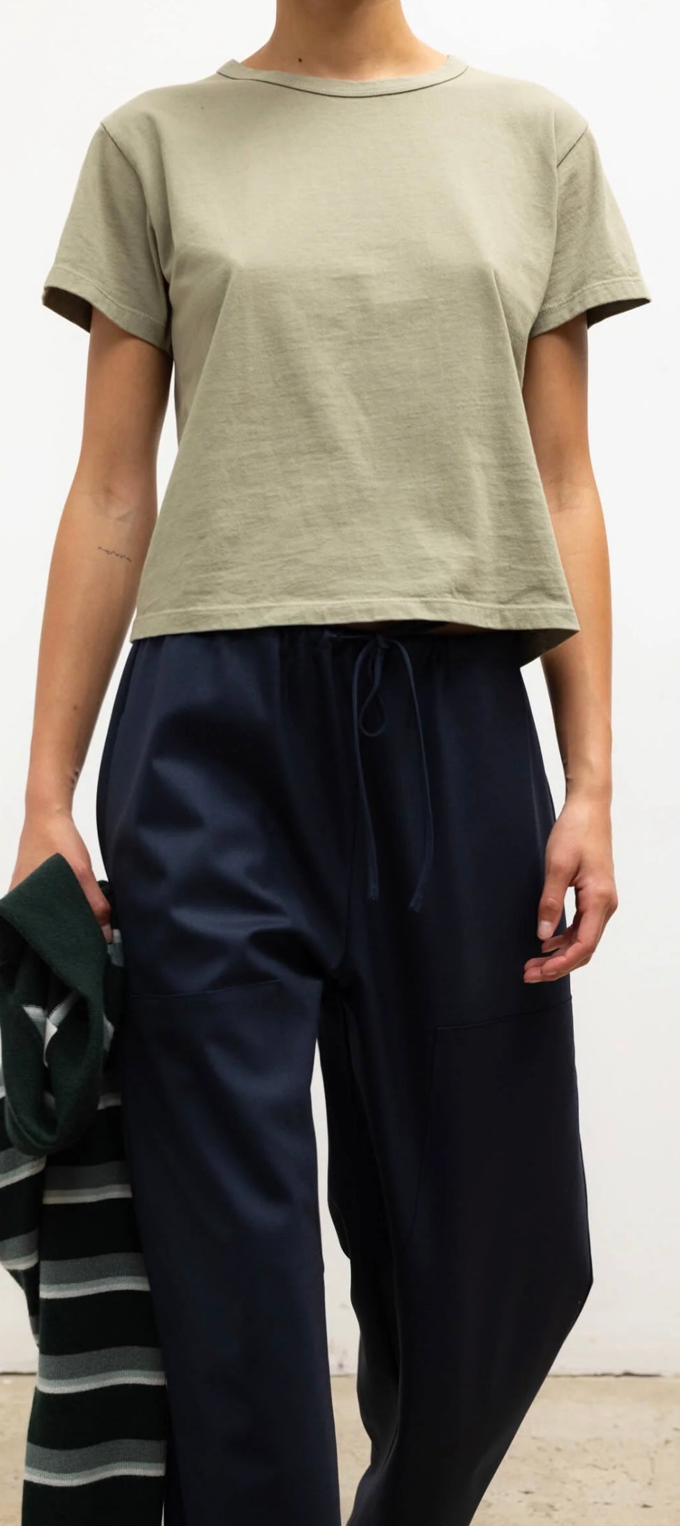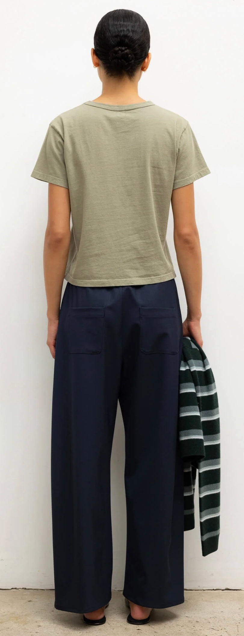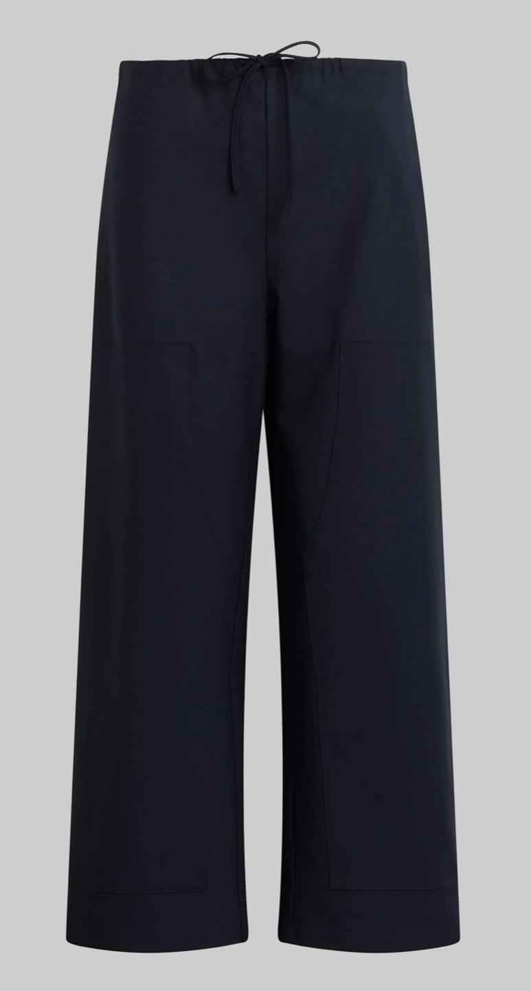 Cut in our RWS certified Jane Stretch Wool, The Jane Carpenter Pant is a pull-on style trouser, featuring a baggy leg silhouette that hits at the ankle, topstitched utility panels, and an adjustable drawstring waistband